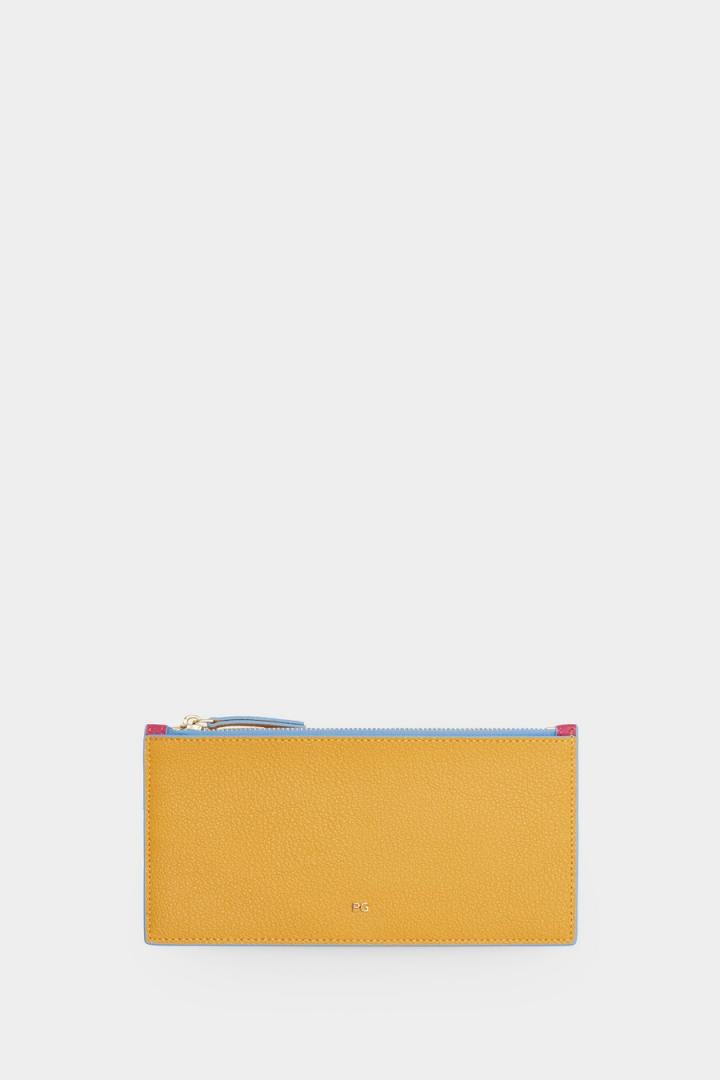 Monedero tarjetero en piel con detalle de logo PG metálico y lujados a contraste. Cierre de cremallera y 8 ranuras para tarjetas en la parte posterior.