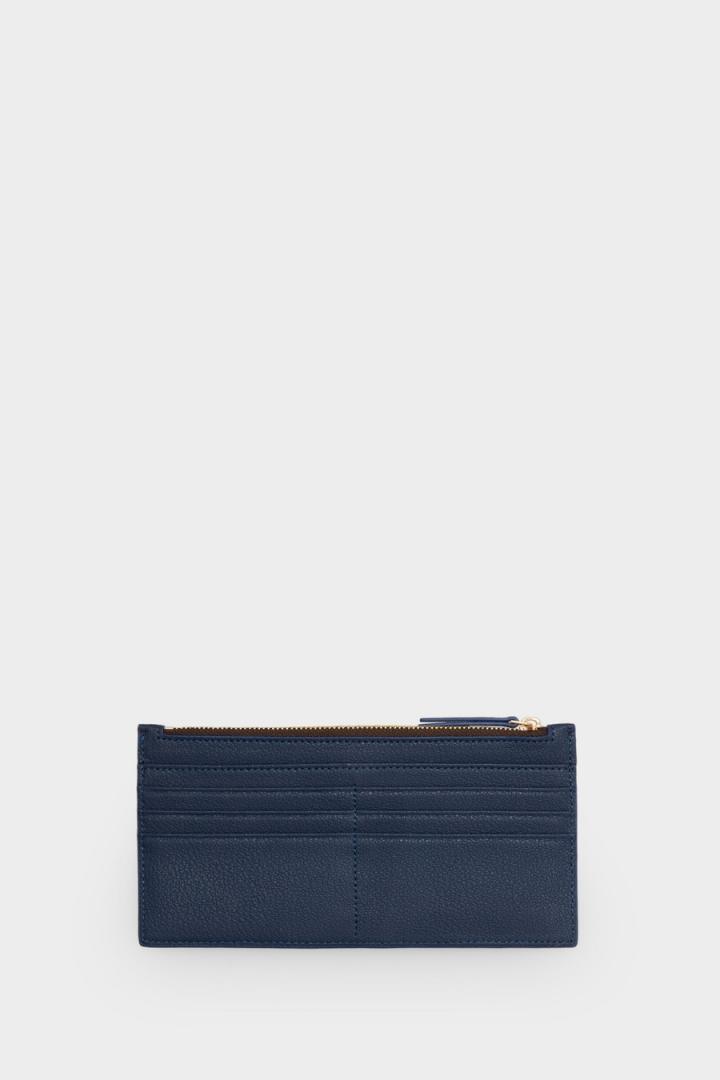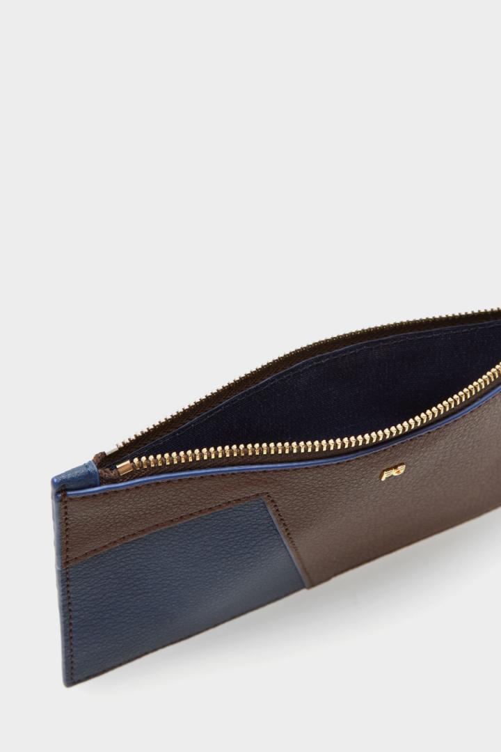 Monedero tarjetero en piel con diseño geométrico, detalle de logo PG metálico y lujados a contraste. Cierre de cremallera y 8 ranuras para tarjetas en la parte posterior.