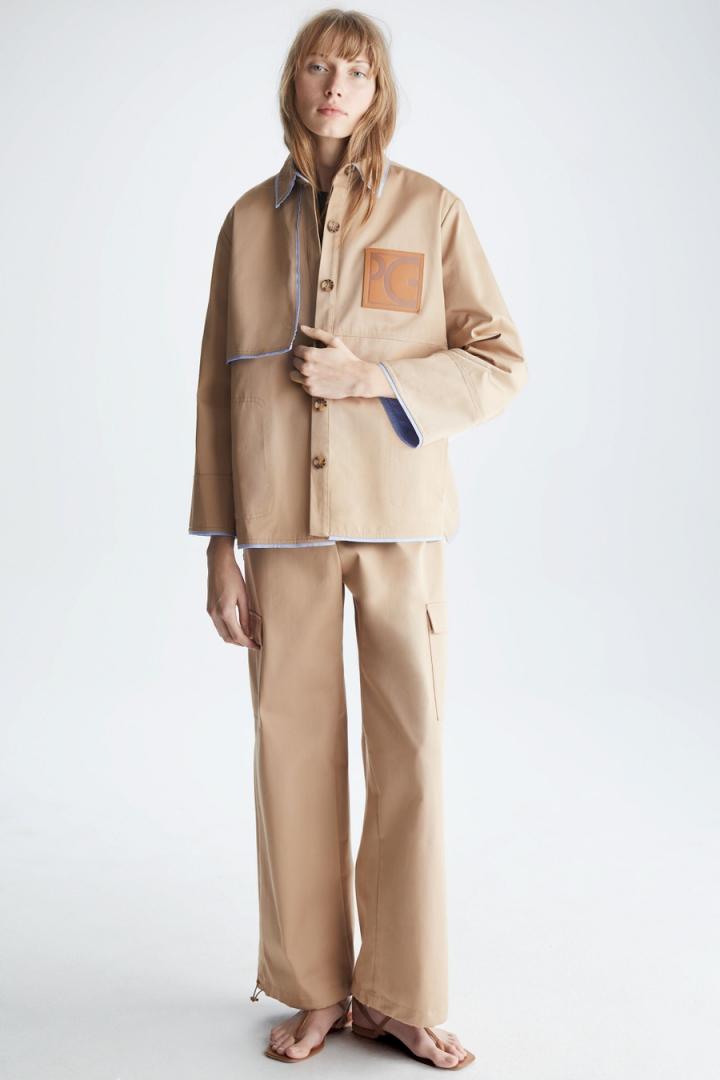 Pantalón cargo de pierna recta en sarga de algodón con bolsillos utilitarios. Cierre de cremallera oculta y botón, dos bolsillos laterales y dos bolsillos parche traseros. Trabillas para cinturón, parche de piel con Cubo PG grabado en la espalda y bajo ajustable con cordones elásticos y reguladores metálicos. Tiene sobrecamisa a conjunto. La modelo mide 178 cm y lleva una talla 36.
