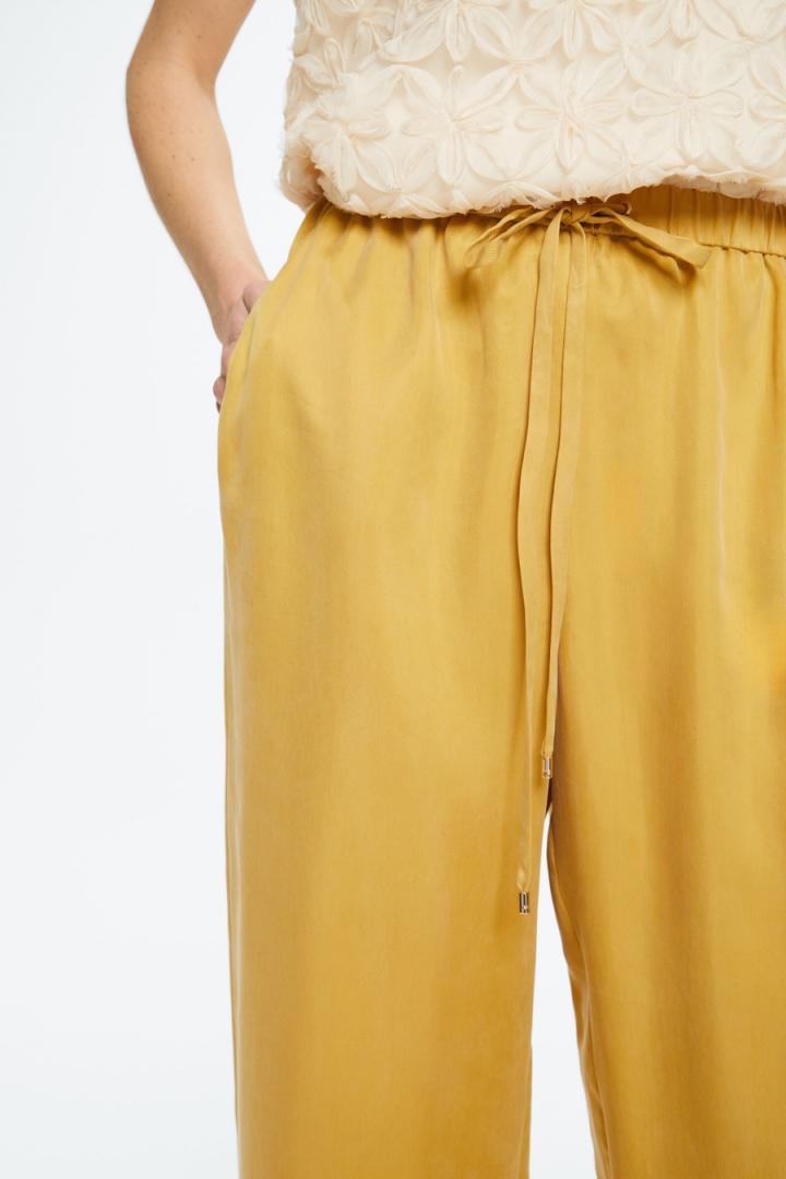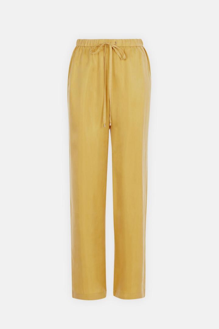 Pantalón pijamero de pierna ancha en cupro de liocel. Cintura elástica ajustable con cordones y bolsillos laterales. Tiene chaqueta sastre a conjunto. La modelo mide 176 cm y lleva una talla XS.