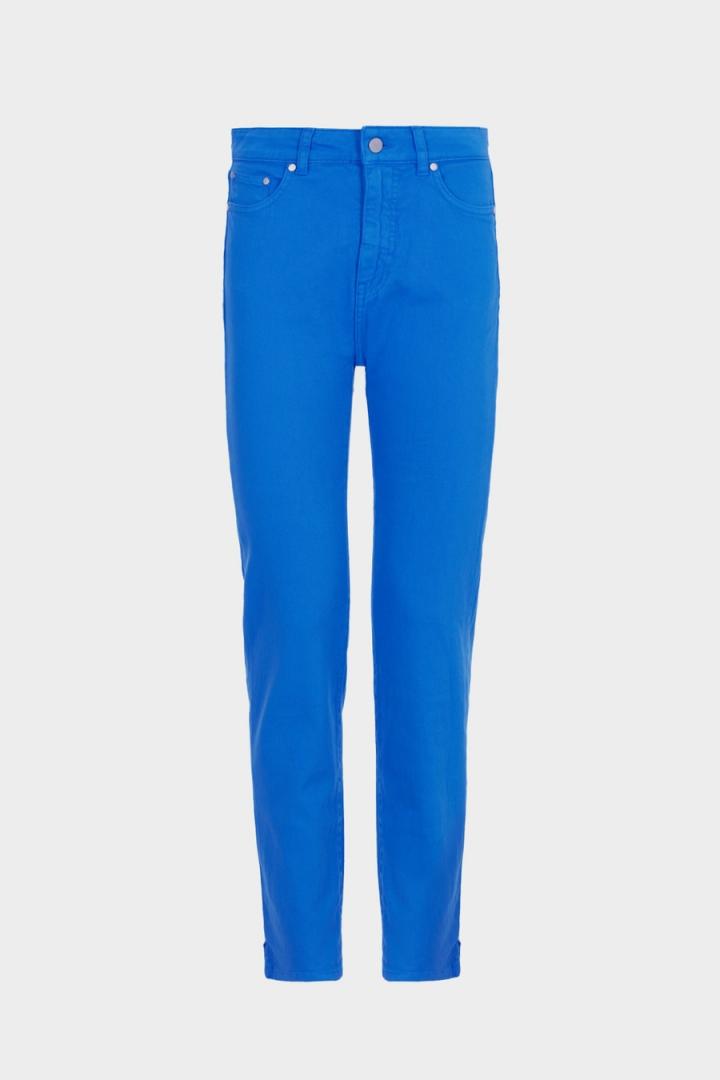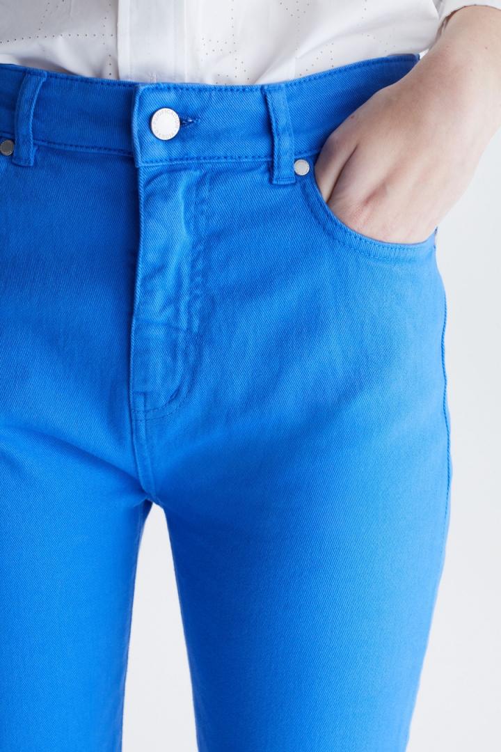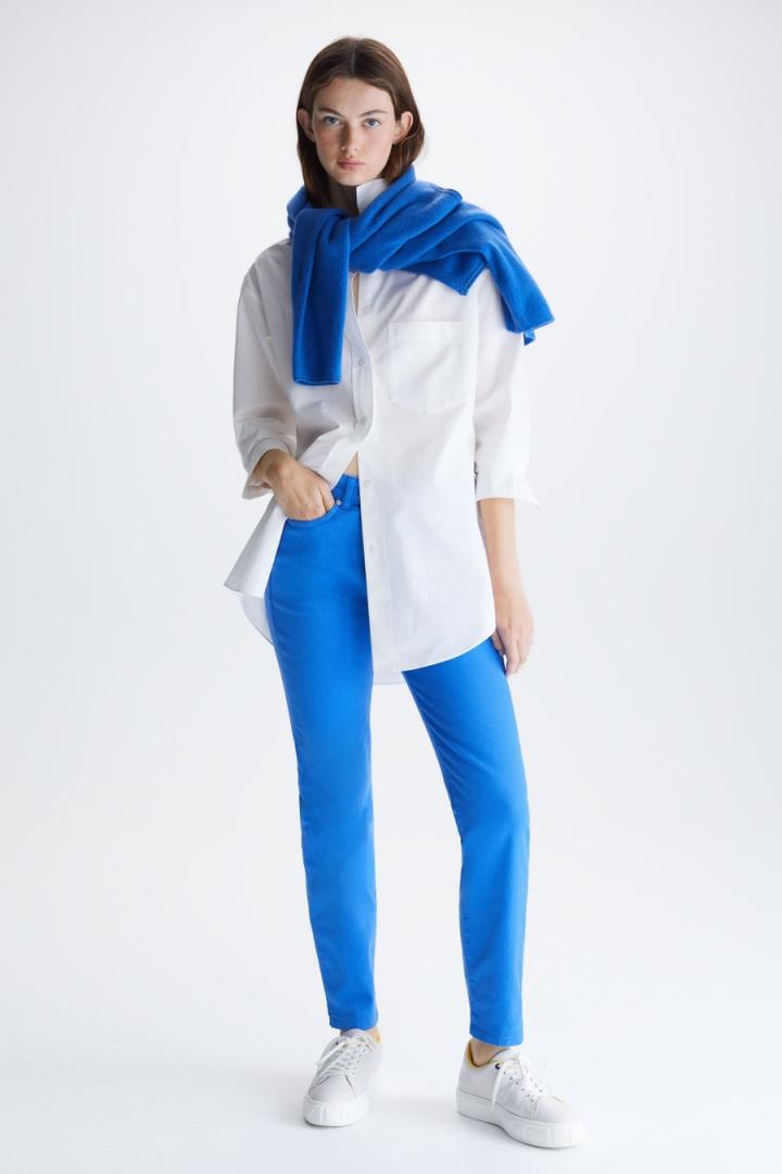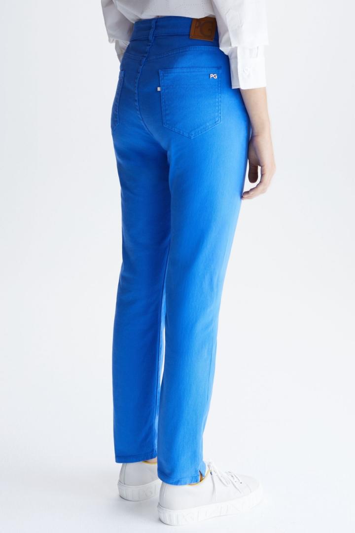 Pantalón pitillo en sarga de algodón stretch. Cierre de botón personalizado y cremallera oculta, bolsillos laterales y dos bolsillos traseros tipo parche. Trabillas para cinturón y abertura lateral en el tobillo. Detalle de etiqueta de piel con Cubo PG en la espalda y logo PG metálico y etiqueta cubo en bolsillo trasero. La modelo mide 178 cm y lleva una talla 36.