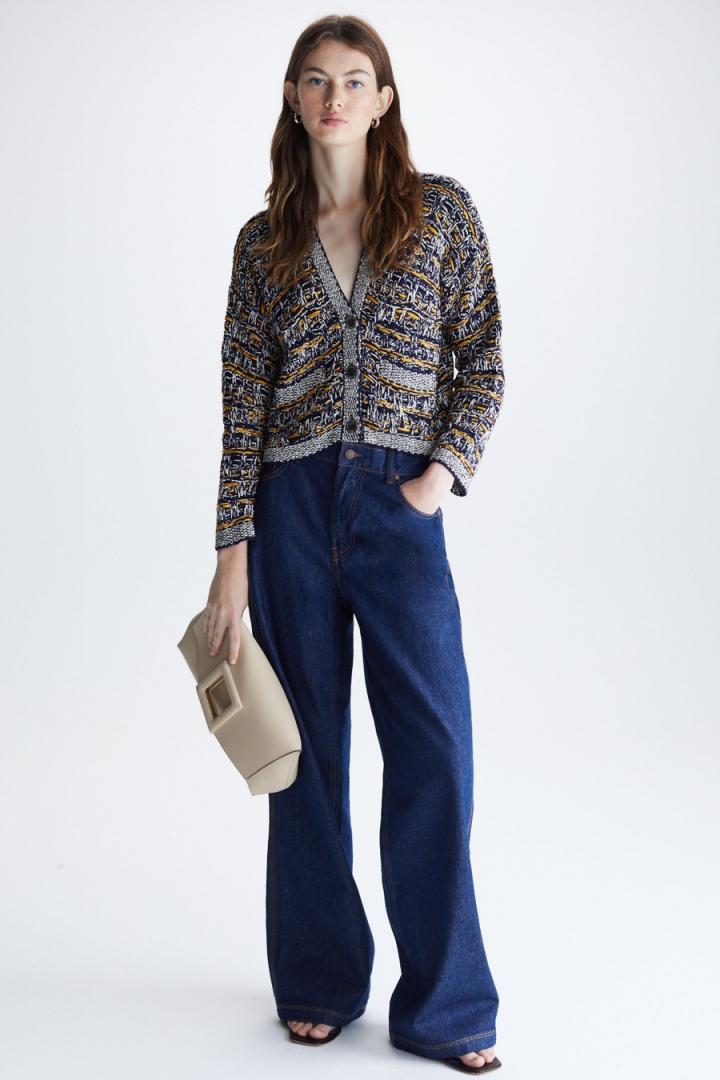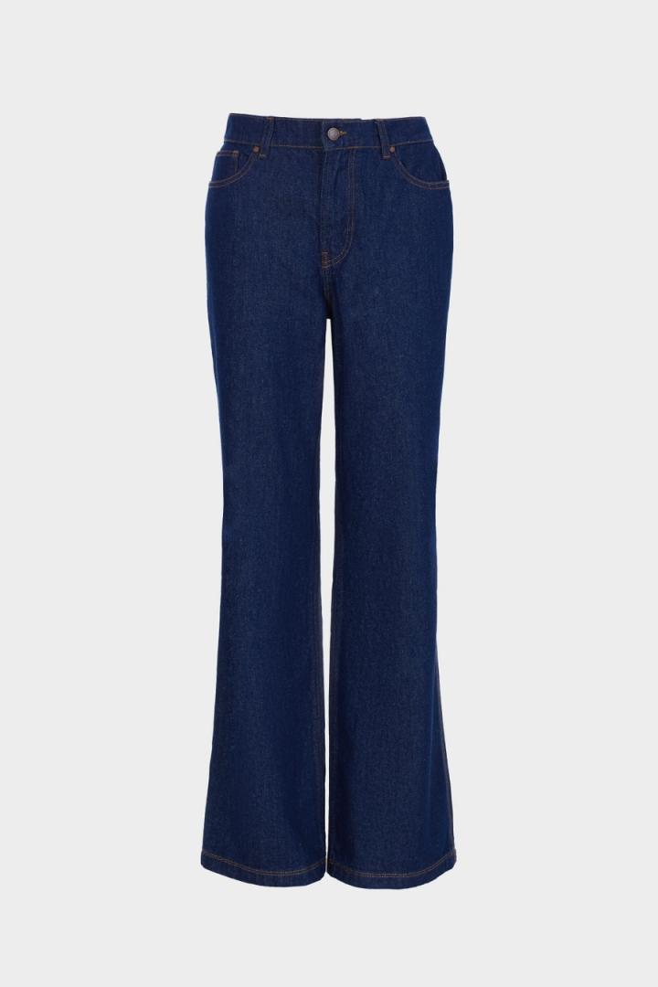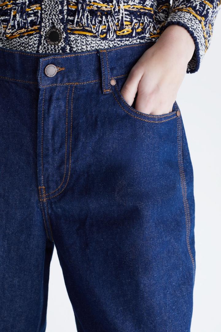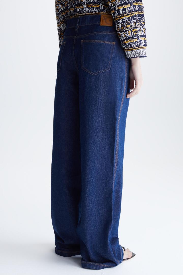 Pantalón de pierna recta en denim de algodón con pespuntes dobles y triples a contraste. Cierre de botón personalizado y cremallera oculta, bolsillos laterales y bolsillos parche traseros. Trabillas para cinturón y etiqueta de piel con Cubo PG grabado en la espalda. La modelo mide 178 cm y lleva una talla 36.