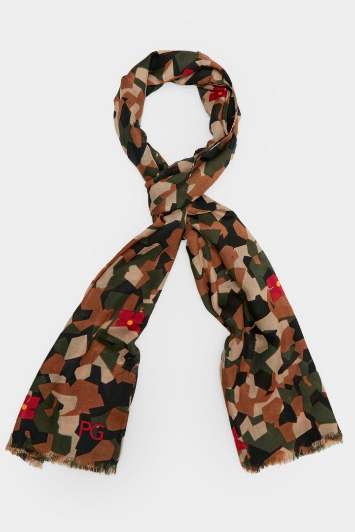 Pashmina de lana con estampado de camuflaje geométrico y detalle de flores a contraste.