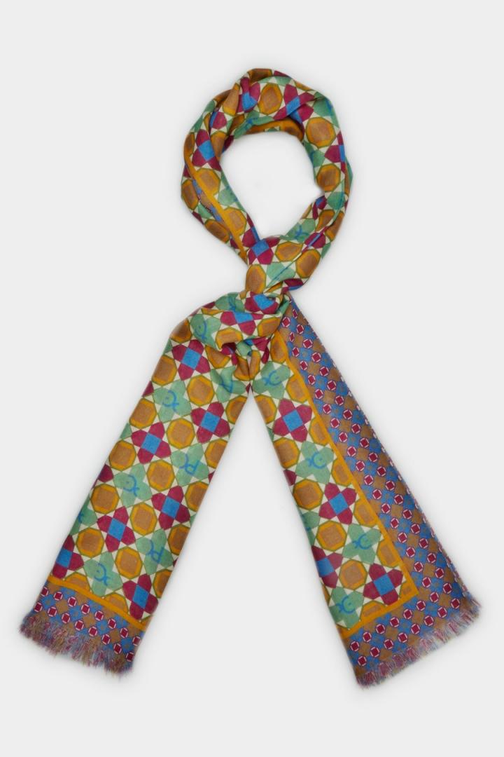 Pashmina de lana con estampado geométrico Granada y terminaciones desflecadas.