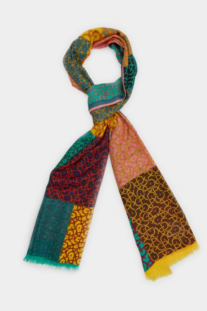 Pashmina de lana con estampado patchwork de cubos y logos PG.