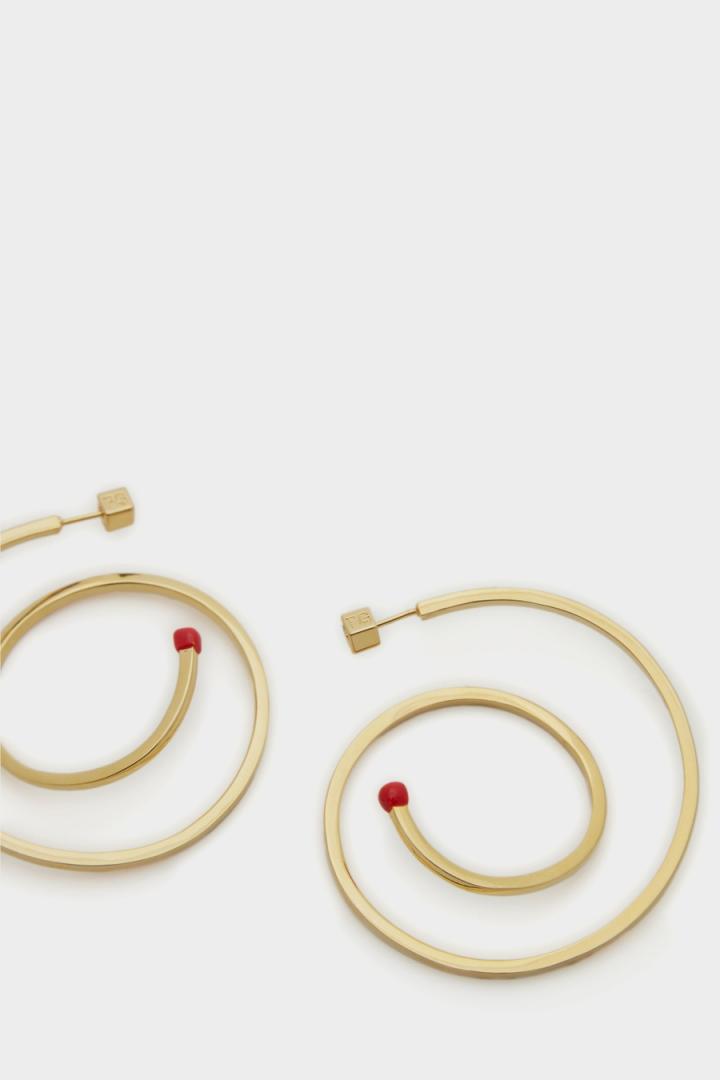 Pendientes de aro bañados en oro con punta esmaltada en color rojo. Cierre con tuerca a presión en forma de cubo con logo PG grabado….