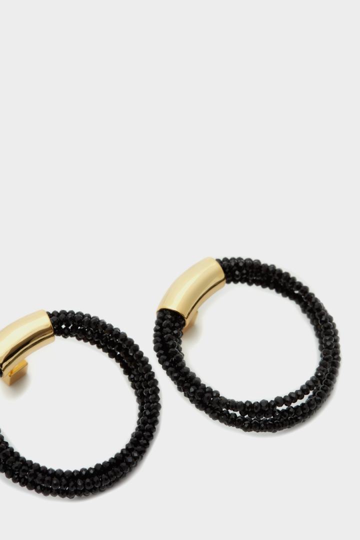 Pendientes de aro bañados en oro con tres hileras de cuentas de cristal negro. Cierre de tuerca a presión con forma de cubo.