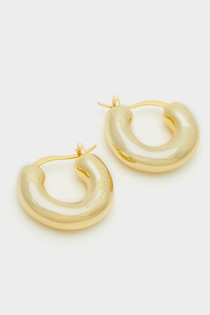 Pendientes bañados en oro con forma de aro y detalle de logo grabado. Cierre criolla.