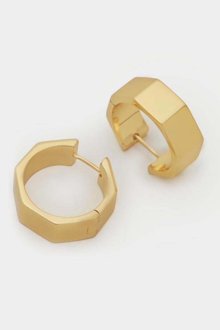 Pendientes de aro bañados en oro con diseño geométrico. Cierre de criolla.