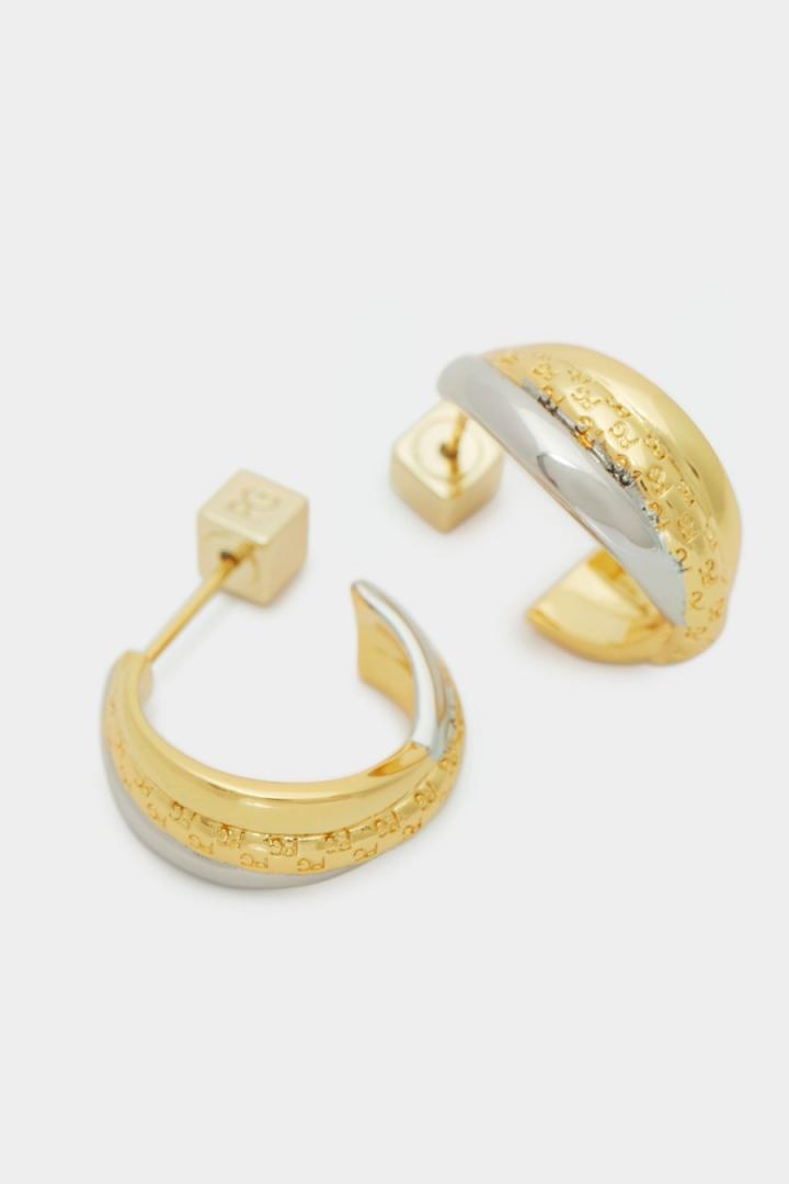 Pendientes de aro bañados en oro y rodio con grabado PG. Cierre con tuerca a presión en forma de cubo.