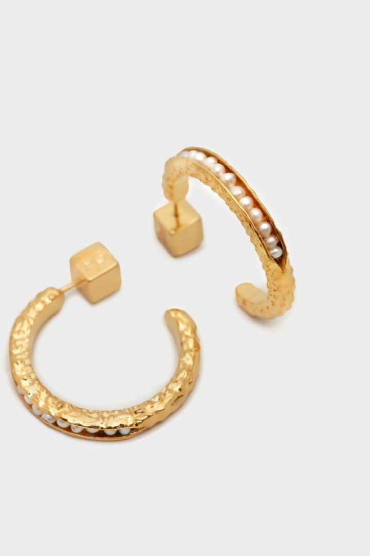 Pendientes de aro bañados en oro con perlas. Cierre con tuerca a presión en forma de cubo.
