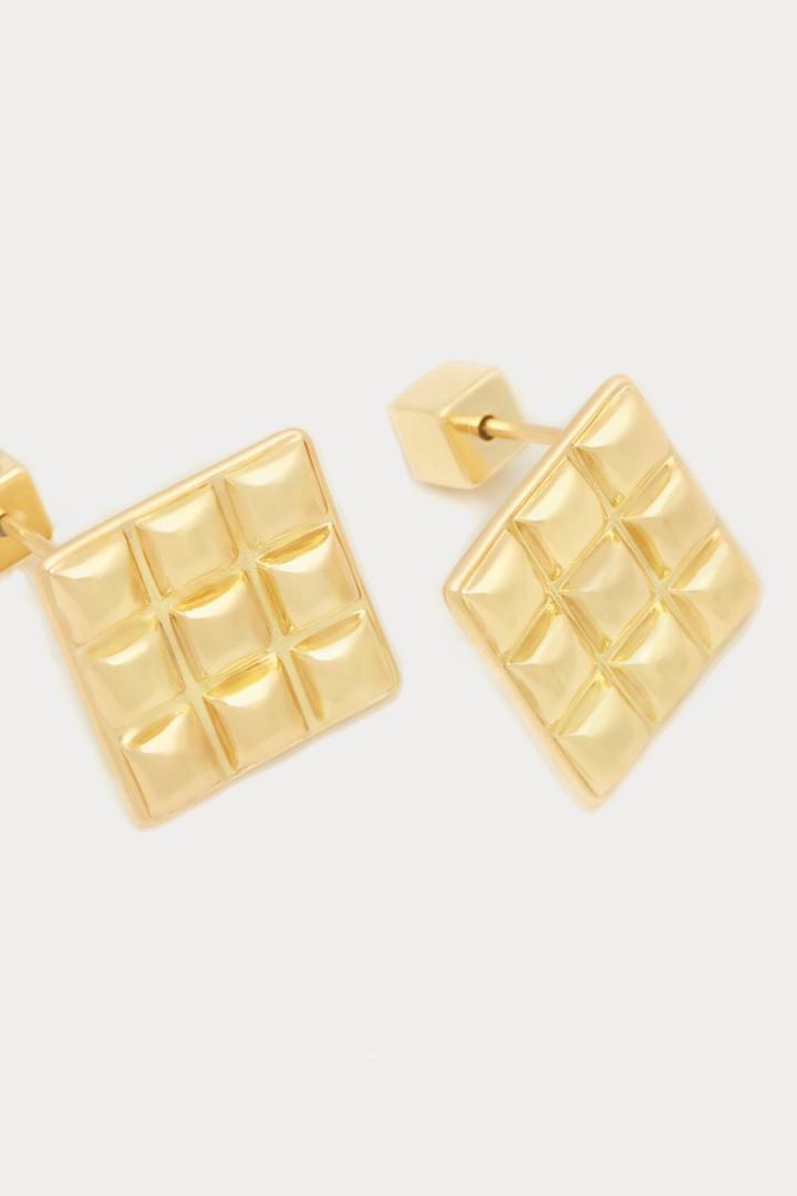 Pendientes bañados en oro con diseño de cubos en relieve. Cierre de tuerca a presión en forma de cubo.