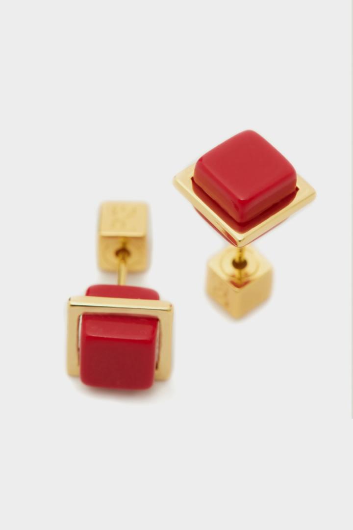 Pendientes bañados en oro con cubo de lapislázuli. Cierre con tuerca a presión en forma de cubo….