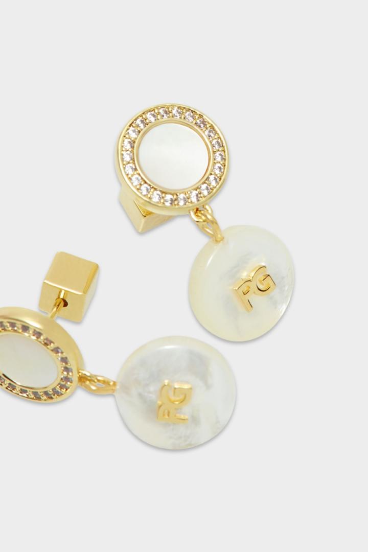 Pendientes bañados en oro con doble medalla de madreperla con logo PG y detalle de cristales. Cierre con tuerca a presión en forma de cubo en forma de cubo.