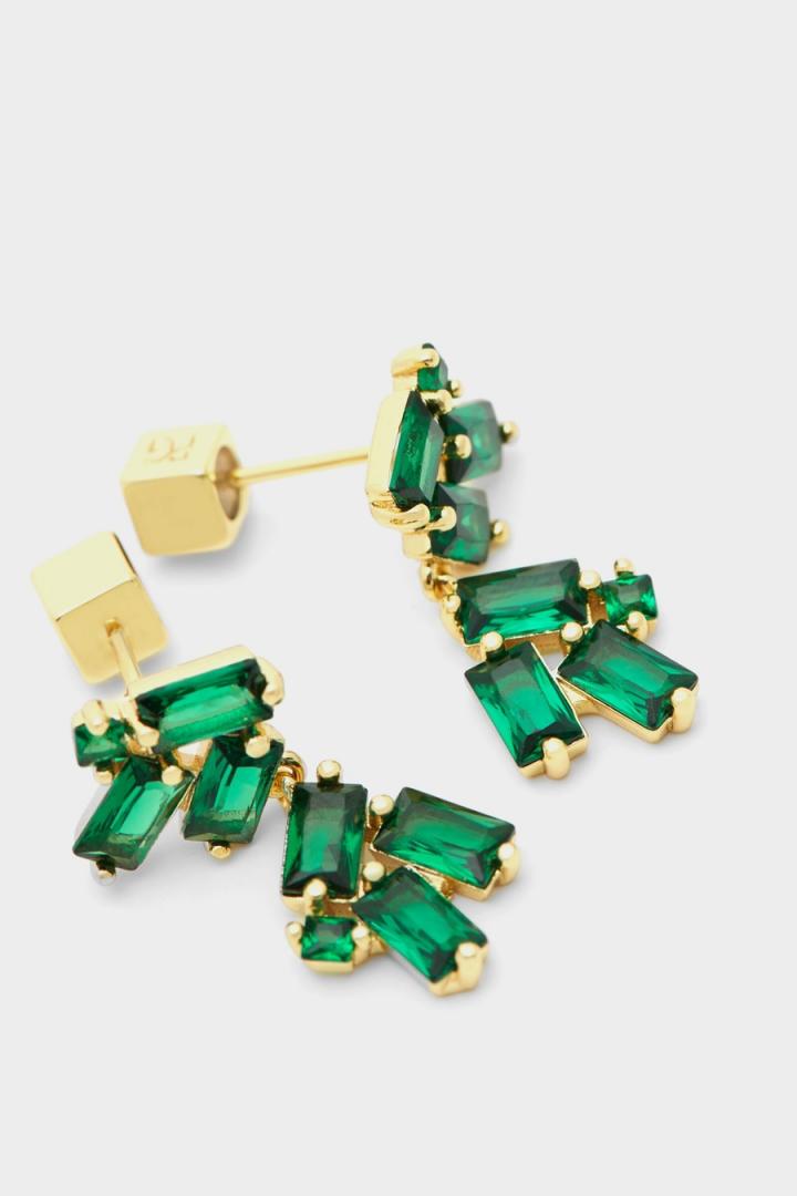 Pendientes bañados en oro compuestos por dos piezas con circonitas de forma rectangular. Cierre con tuerca a presión en forma de cubo.