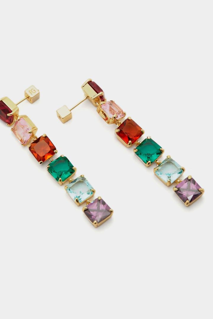 Pendientes largos con cristales multicolor en forma de cubo engarzados en piezas bañadas en oro. Cierre con tuerca a presión en forma de cubo.