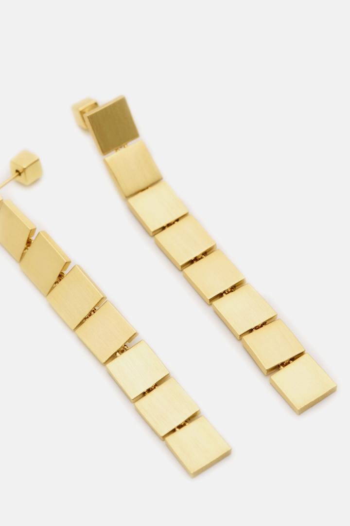 Pendientes largos bañados en oro formados por colgantes de cubos. Cierre con tuerca a presión en forma de cubo.