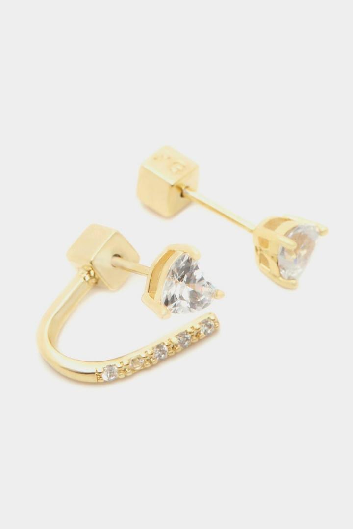 Pendientes bañados en oro con cristales incrustados y detalle en forma de corazón. Cierre con tuerca a presión en forma de cubo.