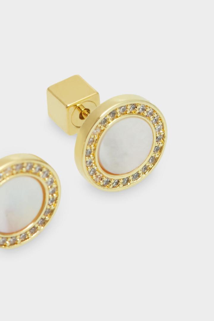 Pendientes bañados en oro con interior de madreperla rodeada de circonitas. Cierre con tuerca a presión en forma de cubo grabado con logo PG….
