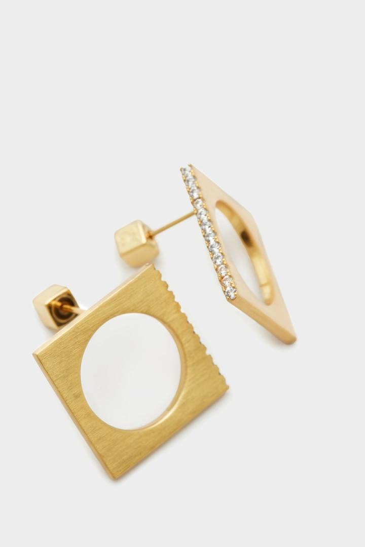 Pendientes bañados en oro formados por un cubo con abertura circular en el interior y un lateral con cristales incrustados. Cierre a presión con tuerca en forma de cubo y logo PG grabado.