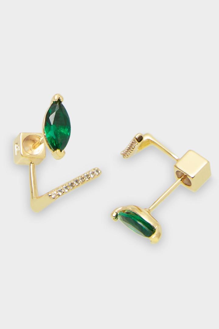 Pendientes bañados en oro con diseño geométrico. Detalle de hilera de circonitas y un cristal verde.