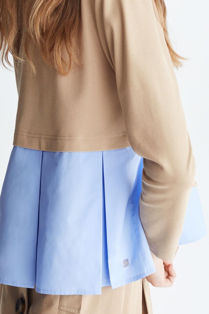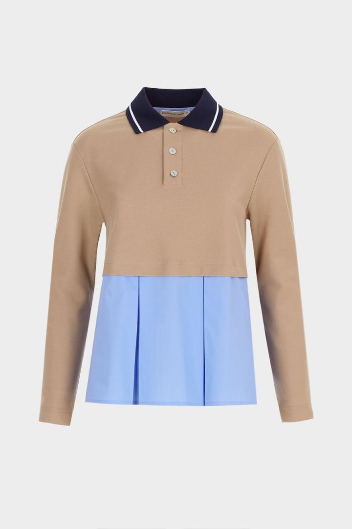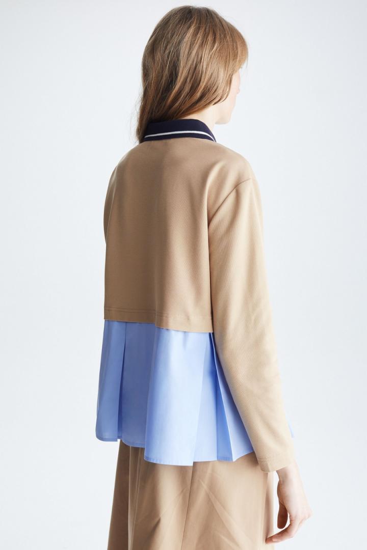 Polo de línea evasé con parte superior en piqué de mezcla de algodón y parte inferior en popelín de algodón tableado a contraste. Cuello polo con raya a contraste, cierre de tapeta hasta el pecho con botones y manga larga. Detalle de cubo metálico con logo PG en el bajo derecho. La modelo mide 178 cm y lleva una talla XS.