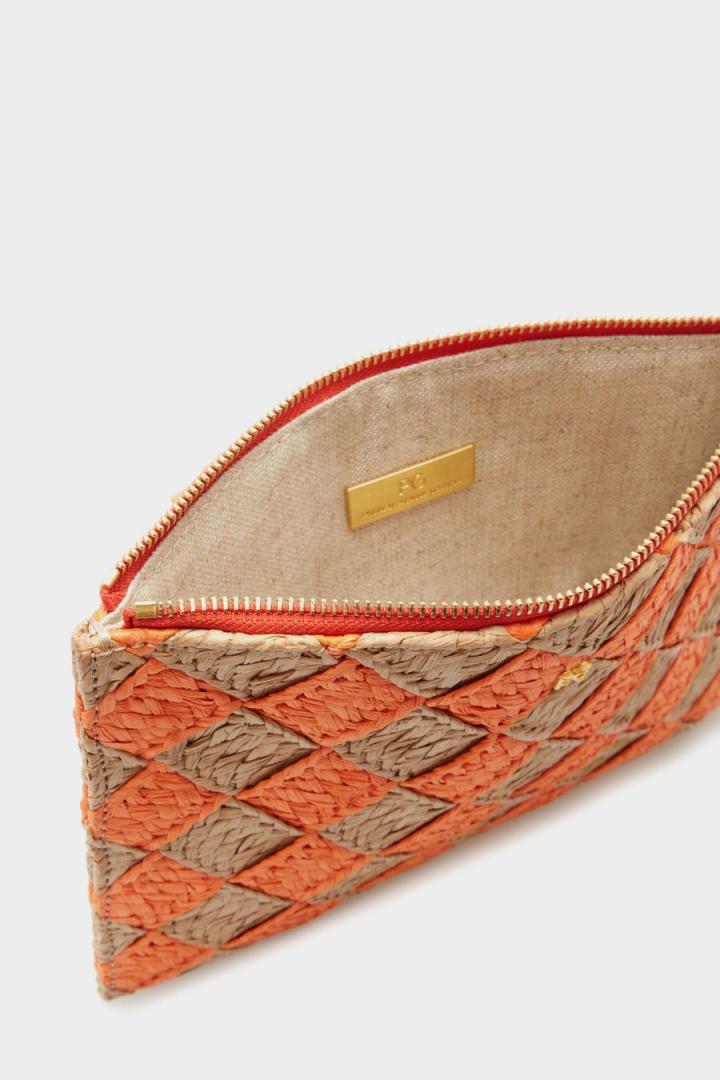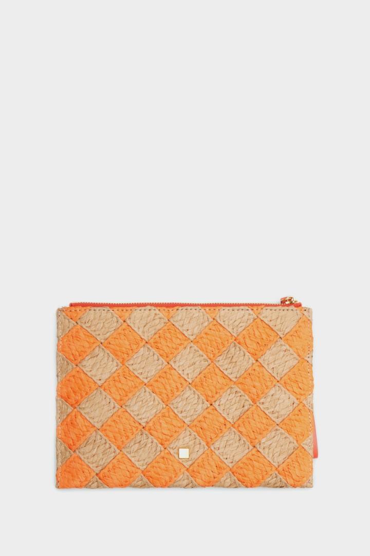Pouch mediano en fibra de papel trenzada con motivo de cubos bicolor. Cierre de cremallera y tirador de piel a to…