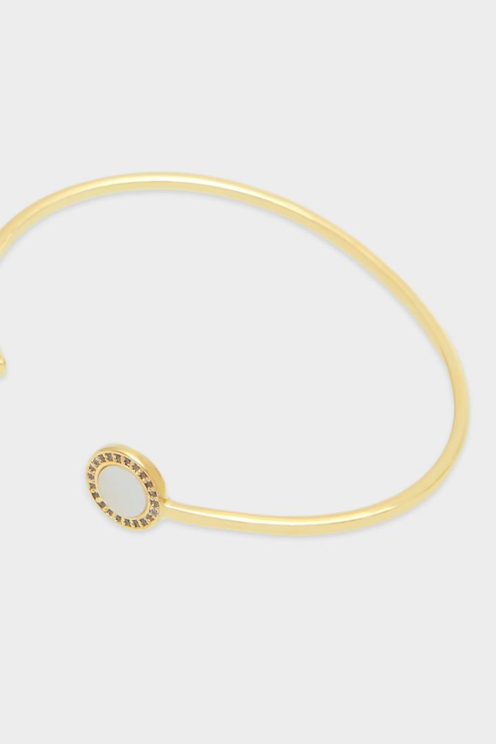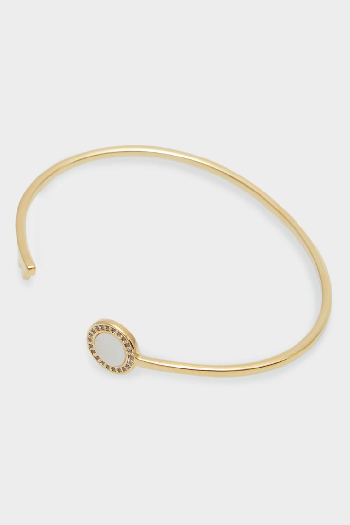 Pulsera rígida abierta y ajustable bañada en oro. Detalle de llave con interior de madreperla y circonitas.