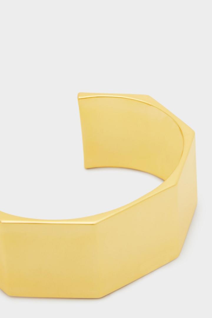 Pulsera rígida bañada en oro con diseño geométrico.