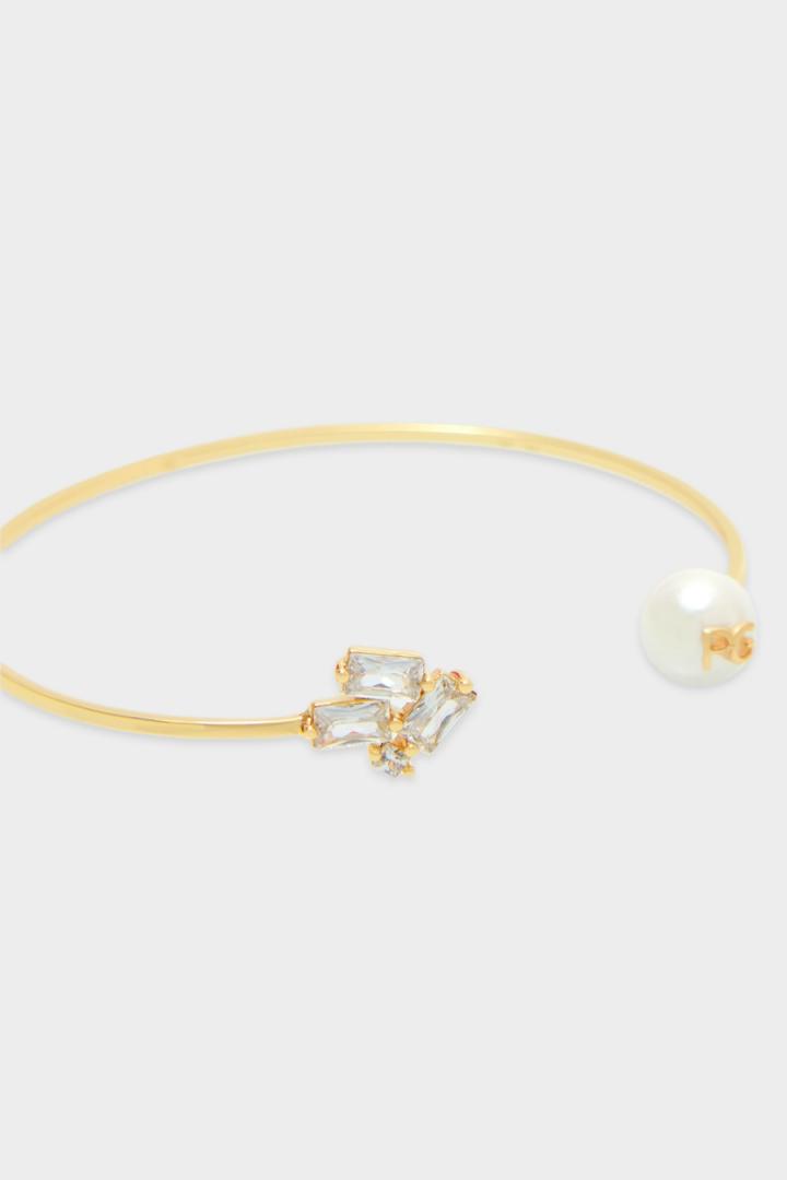 Pulsera rígida bañada en oro con piedras rectangulares engarzadas en un extremo y detalle de perla PG en el otro.