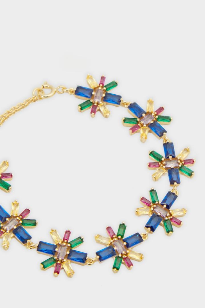 Pulsera bañada en oro con diseño de cristales rectangulares. Cierre de mosquetón ajustable con detalle de cubo grabado con logo PG.