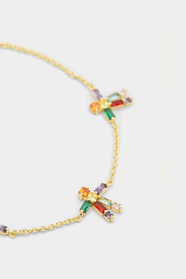 Pulsera bañada en oro con diseño de cristales rectangulares multicolor en forma de Cubi. Cierre de mosquetón ajustable con detalle de cubo.