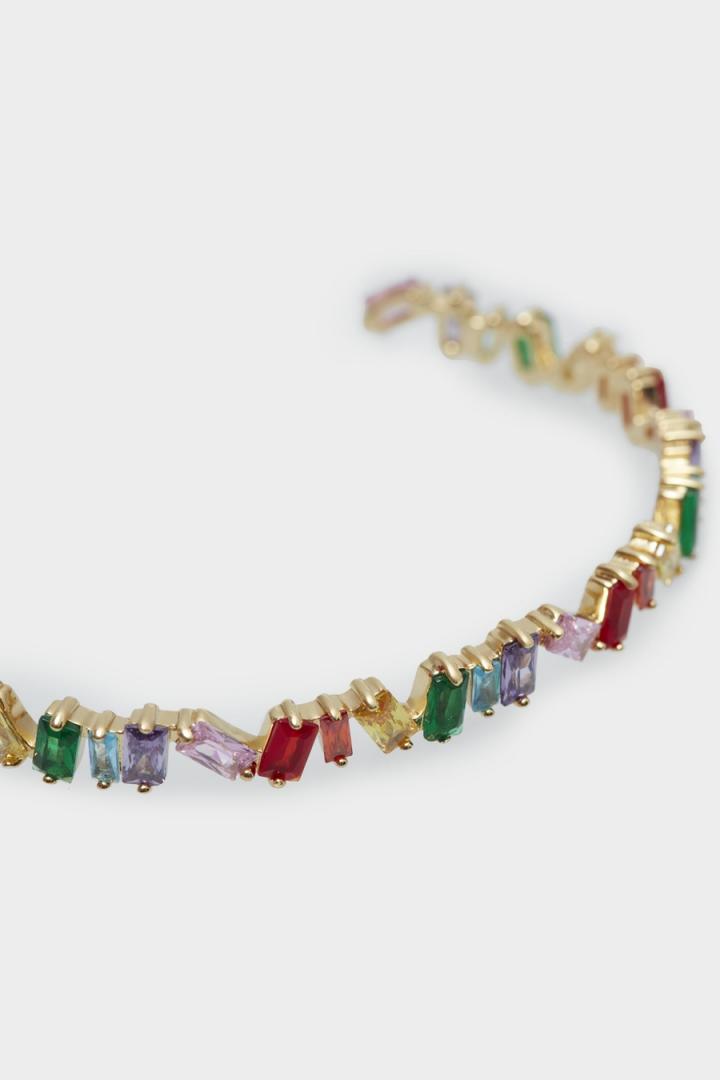 Pulsera rígida bañada en oro con cristales multicolor de forma rectangular.