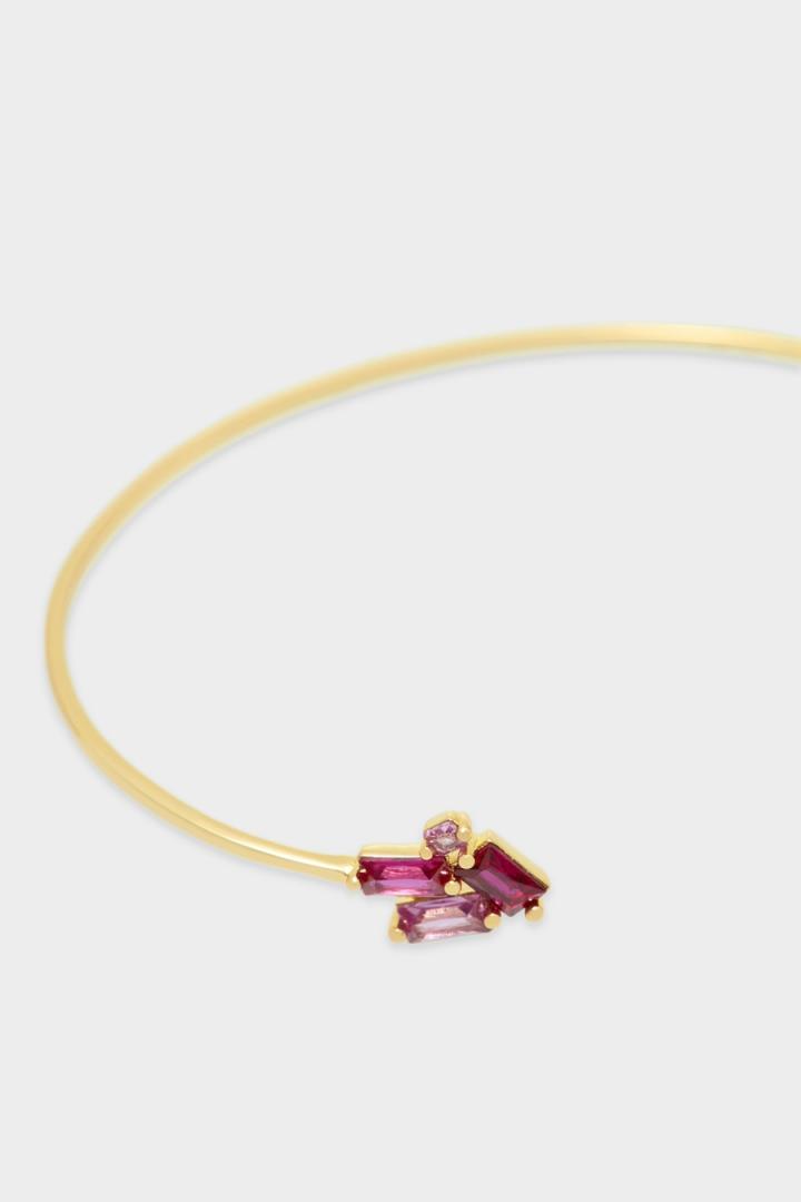 Pulsera rígida bañada en oro con piedras rectangulares engarzadas en los extremos.