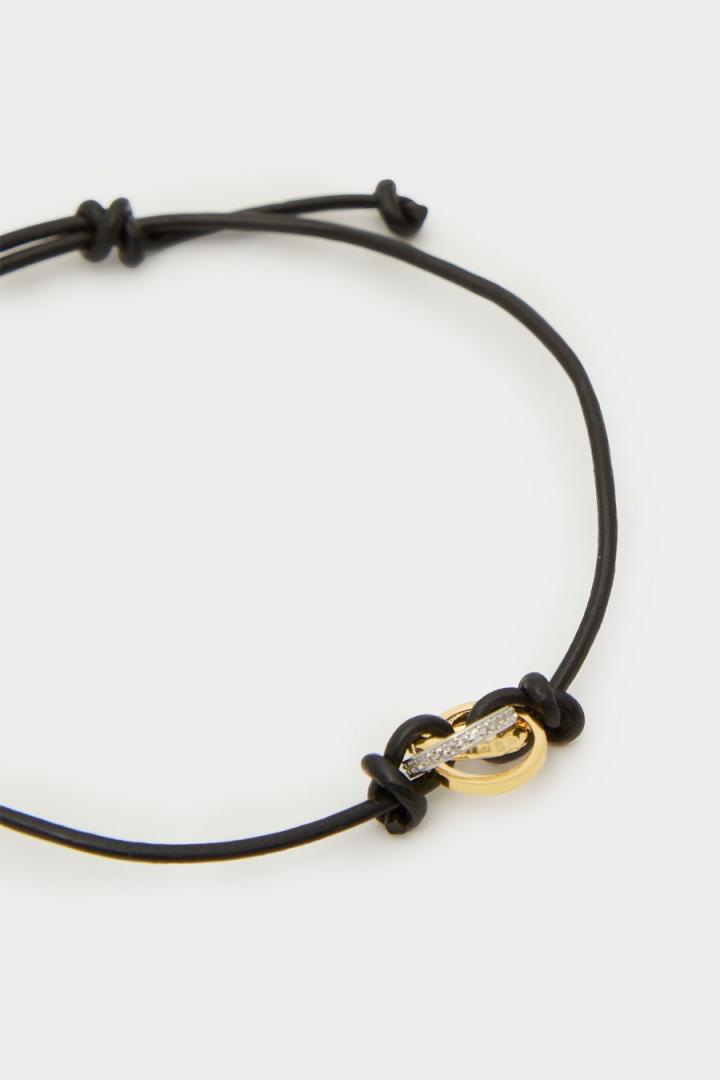 Pulsera de cordón con detalle de aros bañados en oro y rodio con grabado PG y cristales. Cierre de nudo corredizo y detalle de cubo.