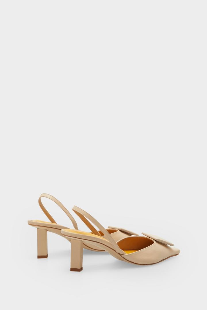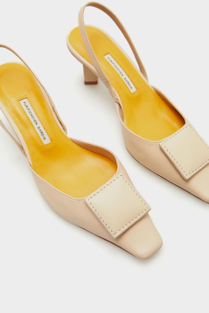 Salón destalonado de tacón medio en piel napa con chapón en forma de cubo a tono. Plantilla de piel a contraste. Tacón: 65 mm.