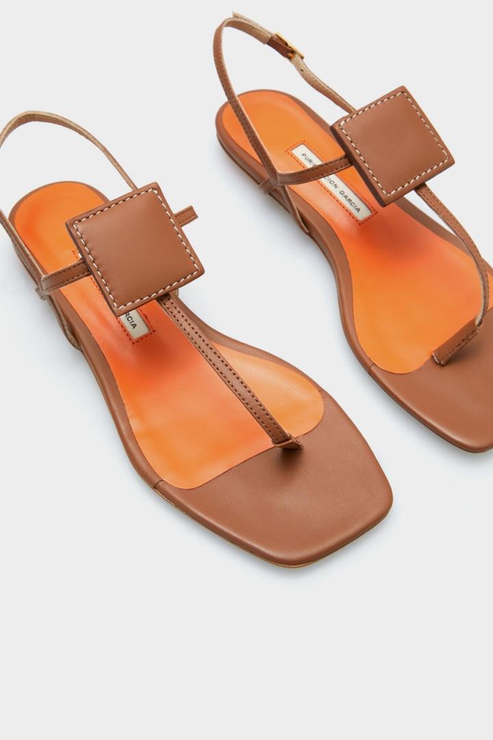 Sandalia plana de piel con tiras y detalle de cubo forrado en piel a tono. Cierre de hebilla ajustable y plantilla de piel….