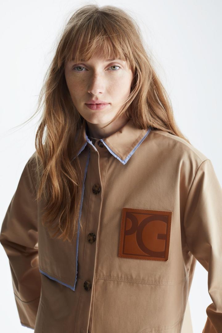 Sobrecamisa de línea oversize en sarga de algodón con detalle de parche de piel con Cubo PG grabado y ribetes a contraste en cuello, puños, bajo y delantero derecho. Cuello camisero, cierre de botones y manga ligeramente acampanada. Canesú con detalle de trabilla y botón y pliegue en la espalda. Tiene pantalón cargo a conjunto. La modelo mide 178 cm y lleva una talla XS.