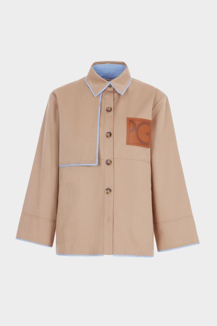 Sobrecamisa de línea oversize en sarga de algodón con detalle de parche de piel con Cubo PG grabado y ribetes a contraste en cuello, puños, bajo y delantero derecho. Cuello camisero, …