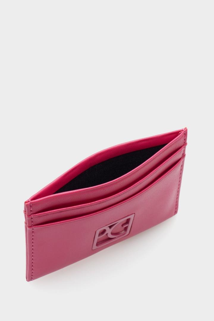Tarjetero en piel con detalle de Cubo PG metálico esmaltado. Cuatro ranuras para tarjetas y compartimento central.