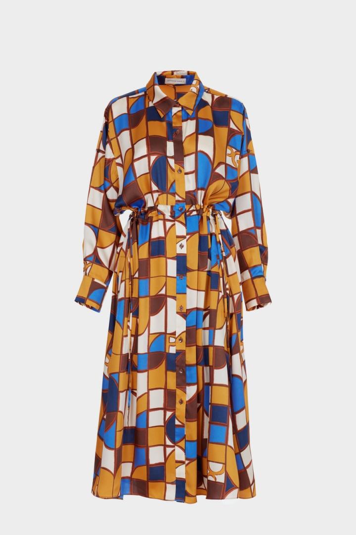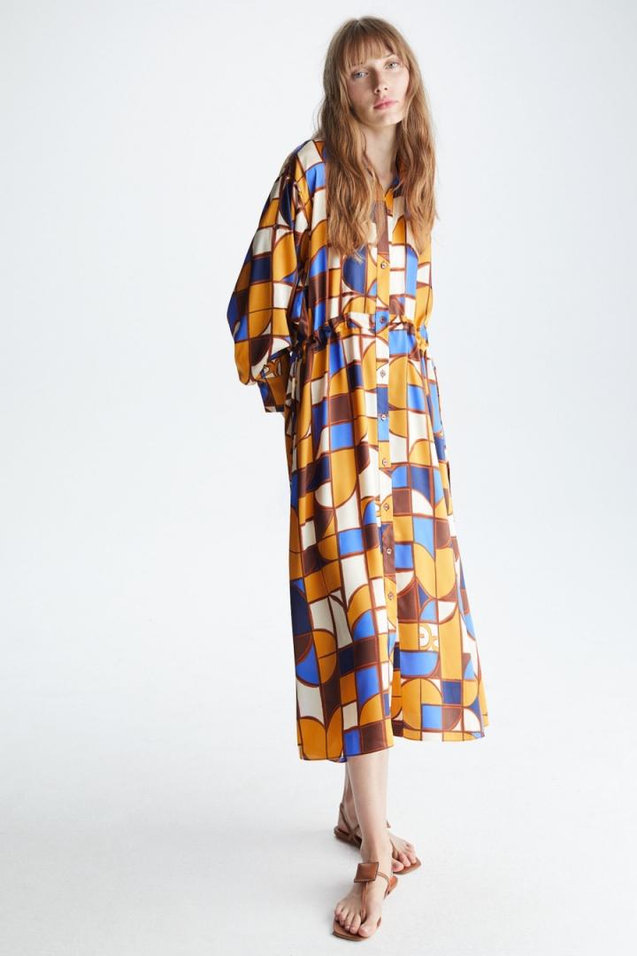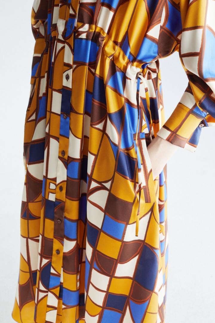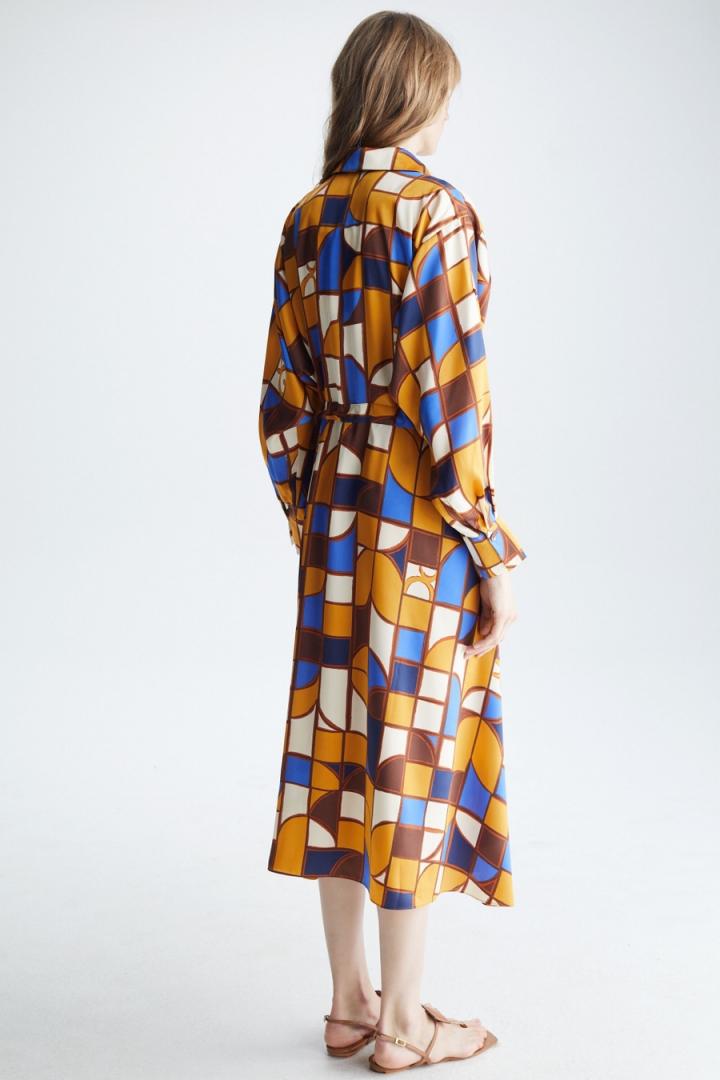 Vestido camisero midi de línea oversize en twill con estampado Bauhaus multicolor. Cuello camisero, cierre frontal de botones, manga larga japonesa con puño camisero y cintura ajustada con fruncidor. La modelo mide 178 cm y lleva una talla XS.