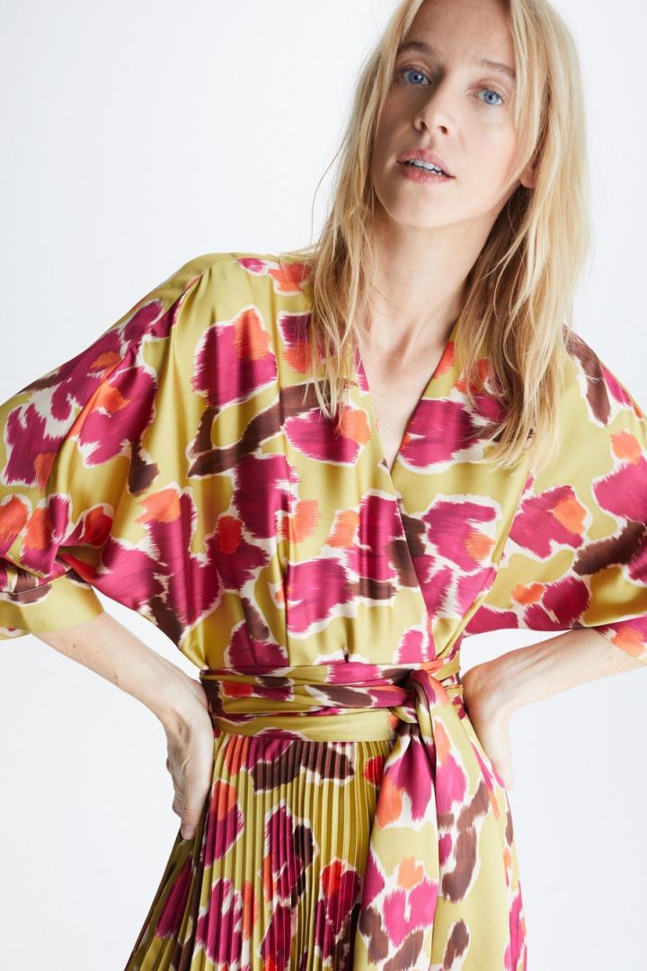 Vestido camisero largo de línea oversize en twill con cuerpo amplio cruzado, falda plisada y estampado floral Ikat multicolor. Escote en pico, manga japonesa con puño abotonado a tono y lazada en el mismo tejido. La modelo mide 180 cm y lleva una talla S.