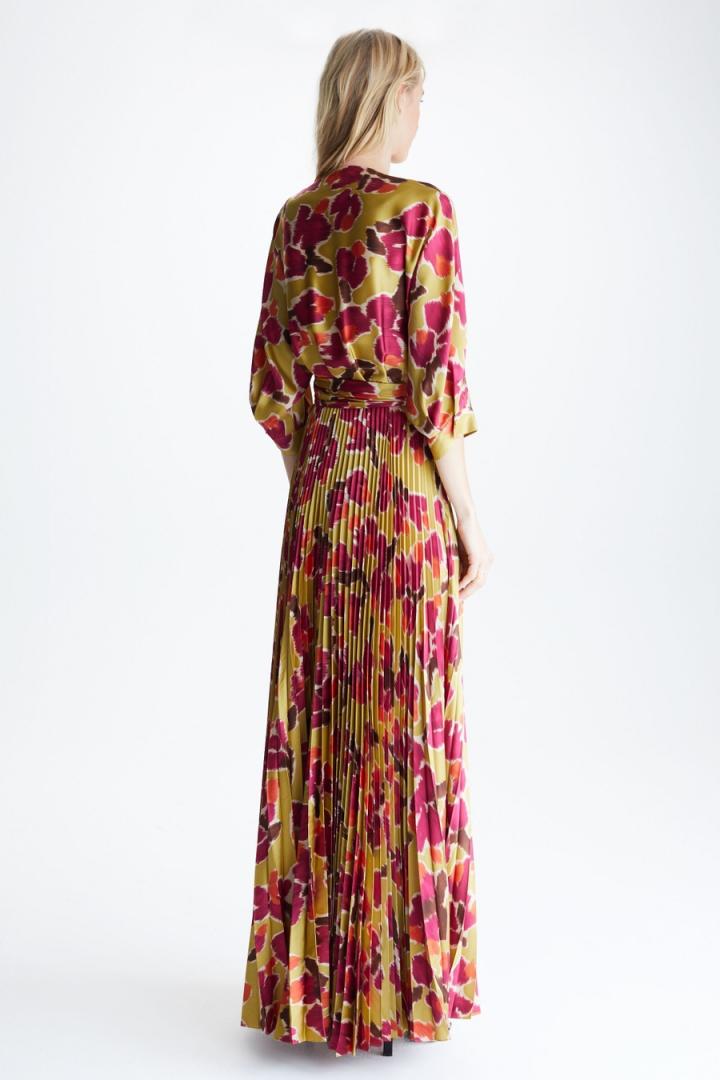 Vestido camisero largo de línea oversize en twill con cuerpo amplio cruzado, falda plisada y estampado floral Ikat multicolor. Escote en pico, manga japonesa con puño abotonado a tono y lazada en el m…