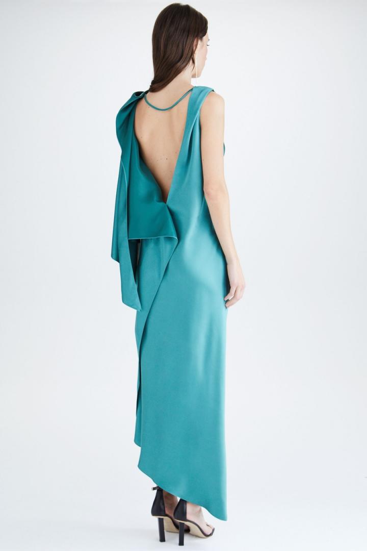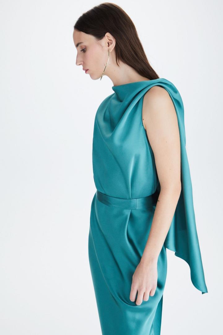 Vestido midi de línea entallada en satén con largo asimétrico y cinturón extraíble para ajustar la cintura en el mismo tejido. Cuello drapeado, manga sisa y espalda al aire …