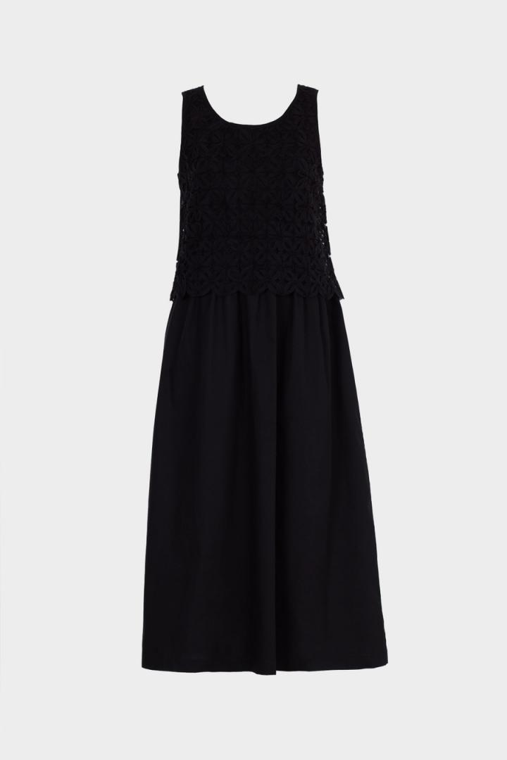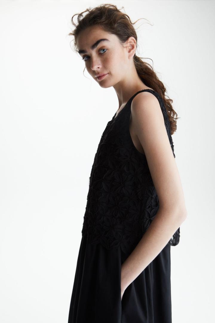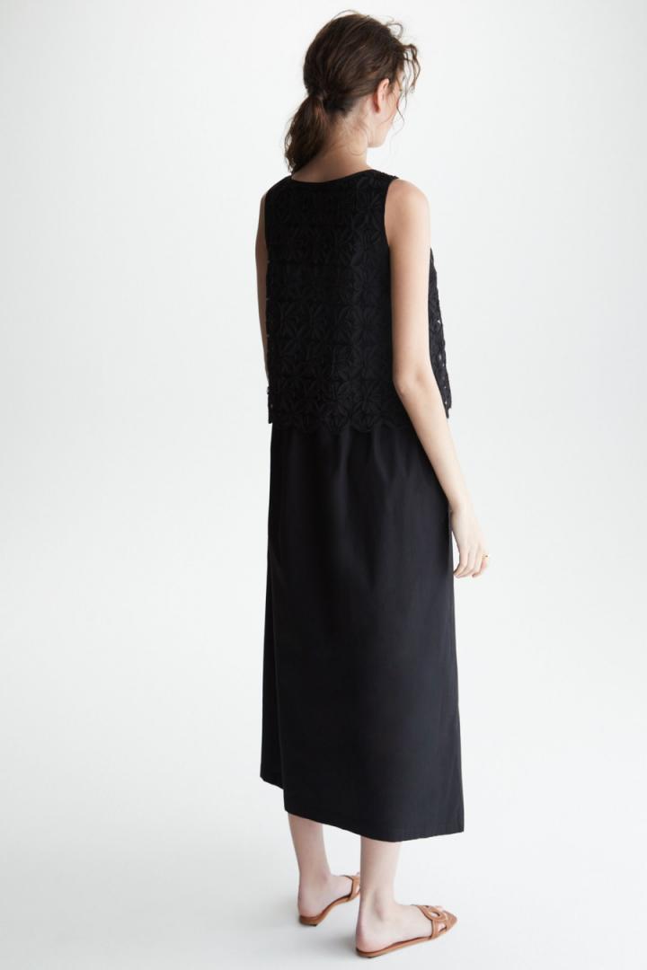 Vestido midi de línea evasé con cuerpo en tul de chiffon bordado y falda en popelín de algodón a tono. Cuello redondo, manga sisa y cintura fruncida con pliegues. Bolsillos laterales, ribetes en chiffon a tono y forro en algodón. La modelo mide 178 cm y lleva una talla XS.
