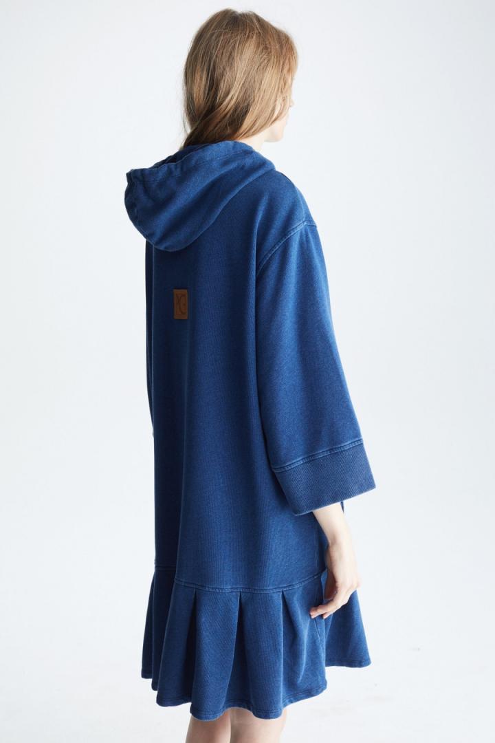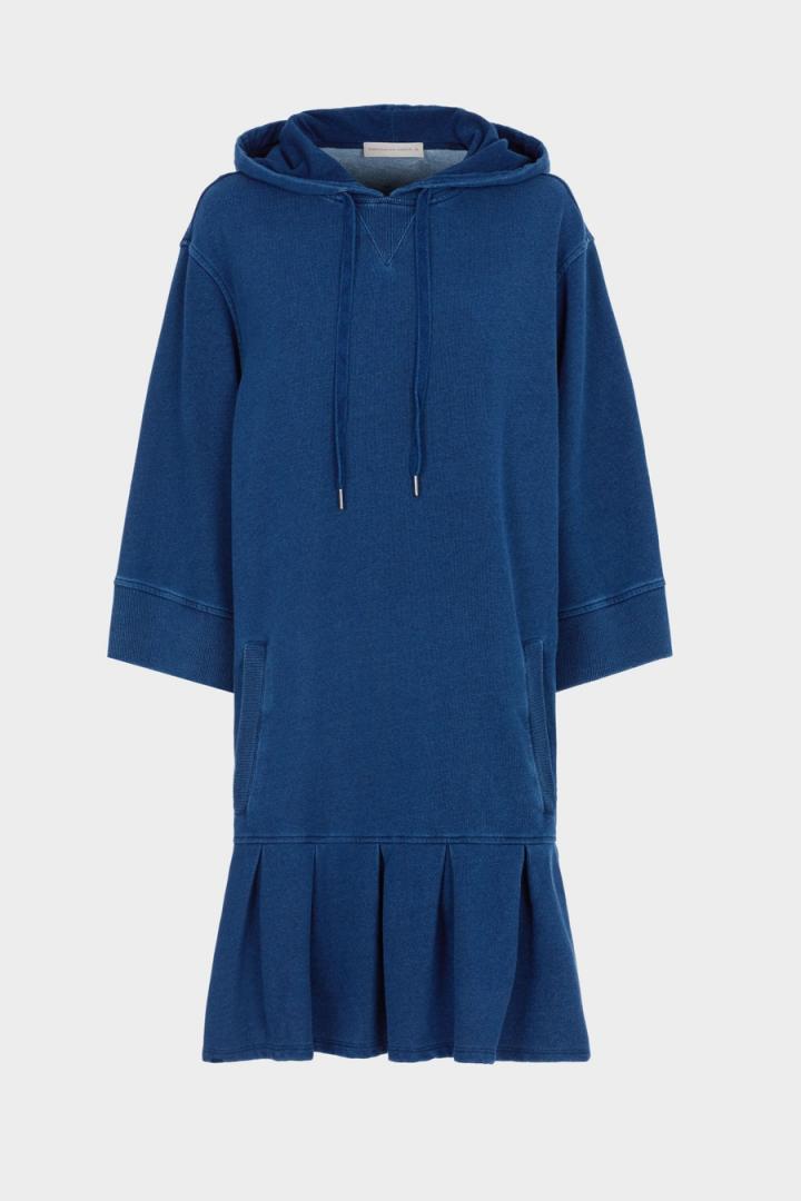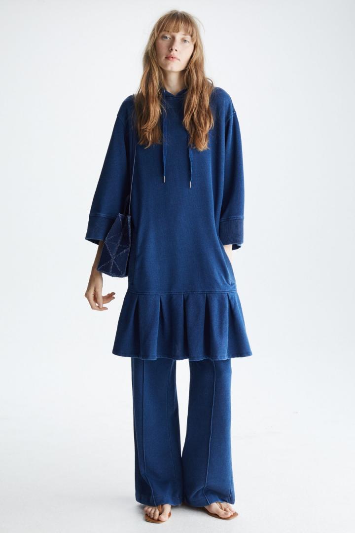 Vestido de línea oversize en felpa de mezcla de algodón con efecto denim y bajo tableado. Cuello con capucha y cordones y detalle de pico acanalado, hombro caído y manga francesa ancha. Puños y bolsillos laterales de vivo acanalados y detalle de etiqueta de piel con Cubo PG grabado en la espalda. La modelo mide 178 cm y lleva una talla S.