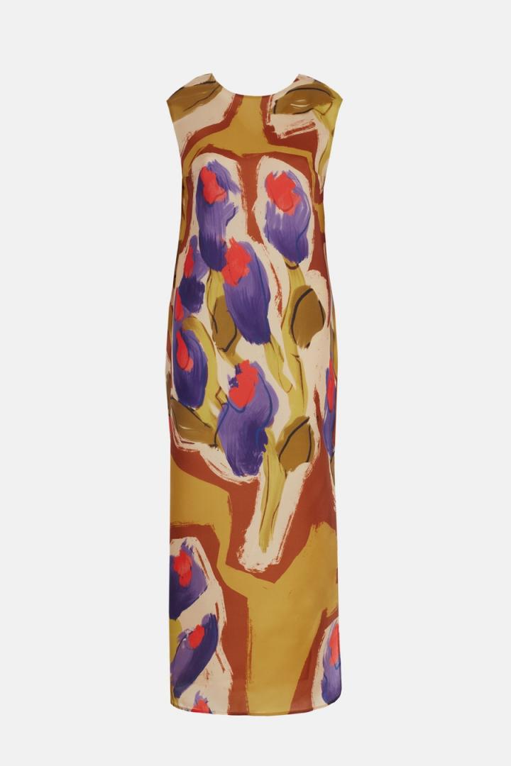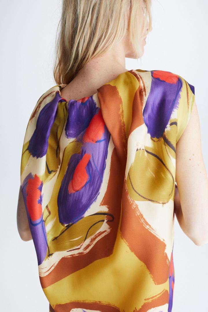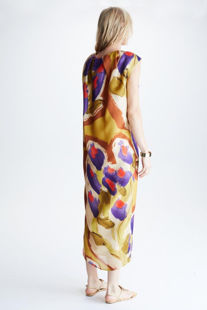 Vestido midi de línea cocoon en organza doble de seda con estampado floral Versalles multicolor y detalle de pliegues en la espalda. Cuello redondo, manga sisa y abertura lateral. La modelo mide 180 cm y lleva una talla XS.