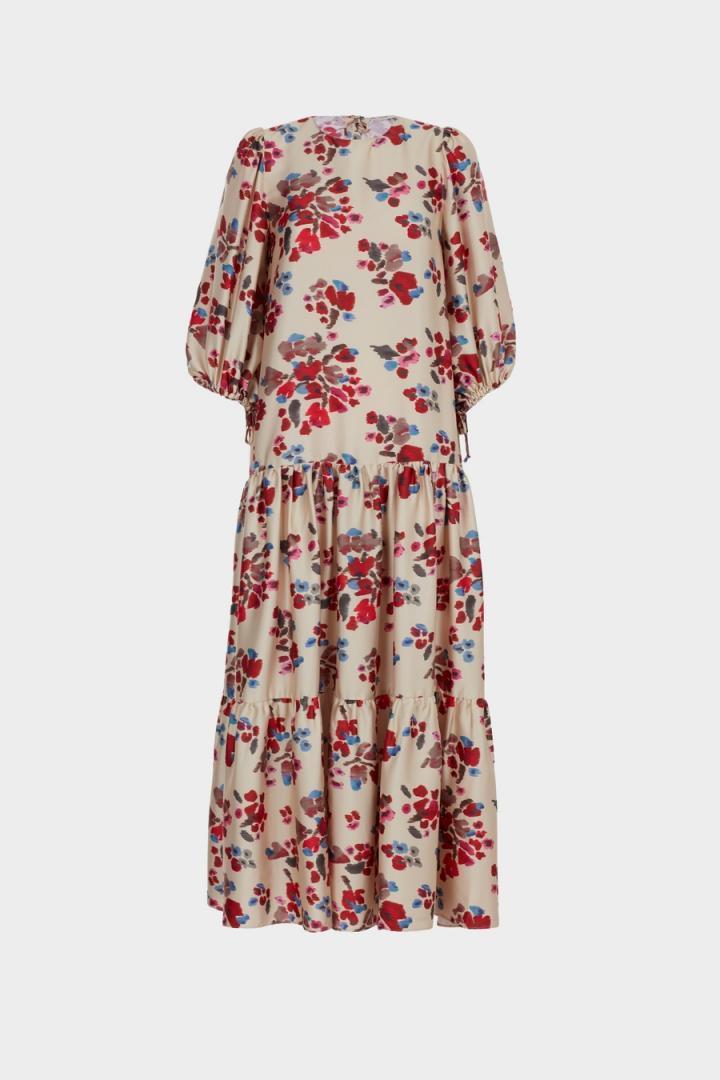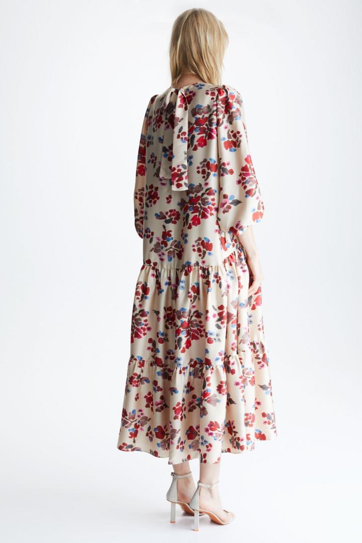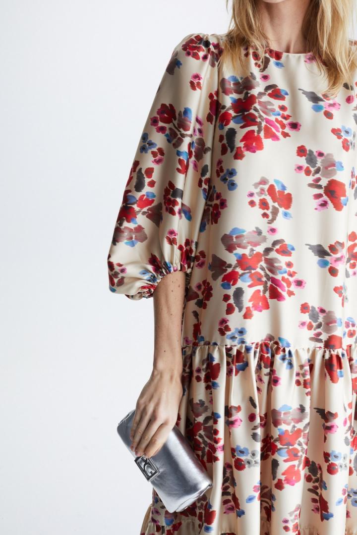 Vestido de línea oversize en twill con estampado floral Bouquet y volantes fruncidos en la falda. Cuello redondo, cierre en la espalda con lazada y manga francesa abullonada con puño ajustado con lazada a tono. La modelo mide 180 cm y lleva una talla XS.