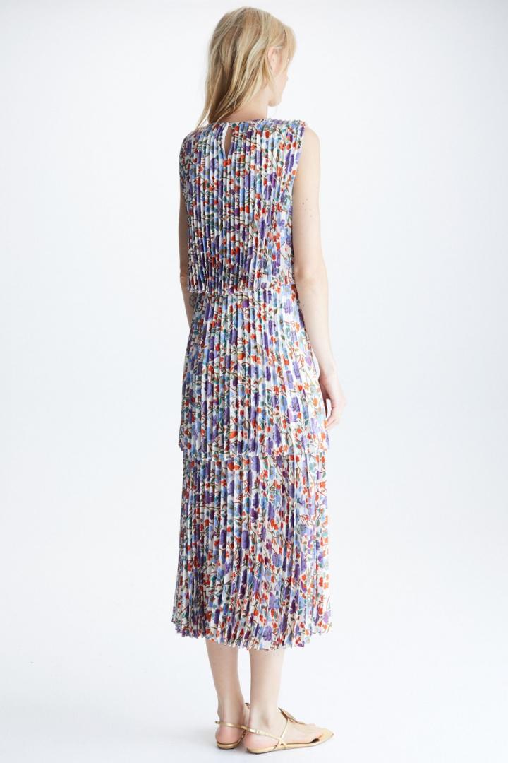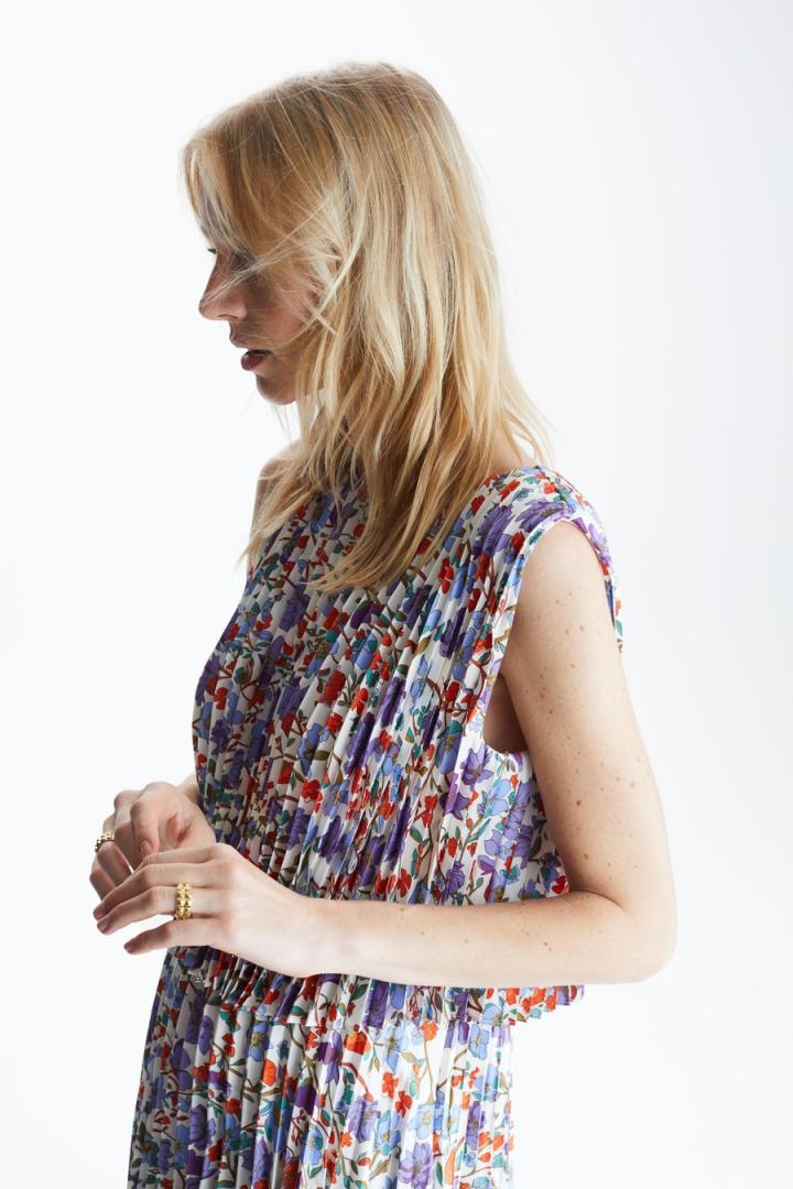 Vestido midi plisado de línea entallada en twill con estampado floral multicolor con tres capas. Cuello redondo, manga sisa y cierre de lágrima con botón en la espalda. La modelo mide 180 cm y lleva una talla S.