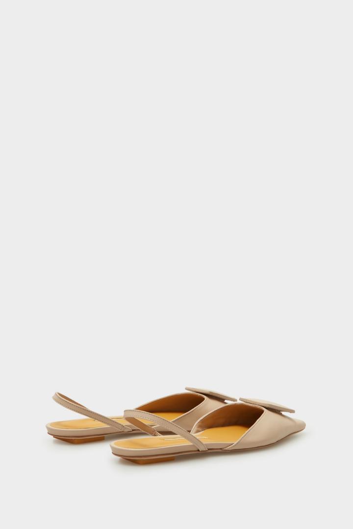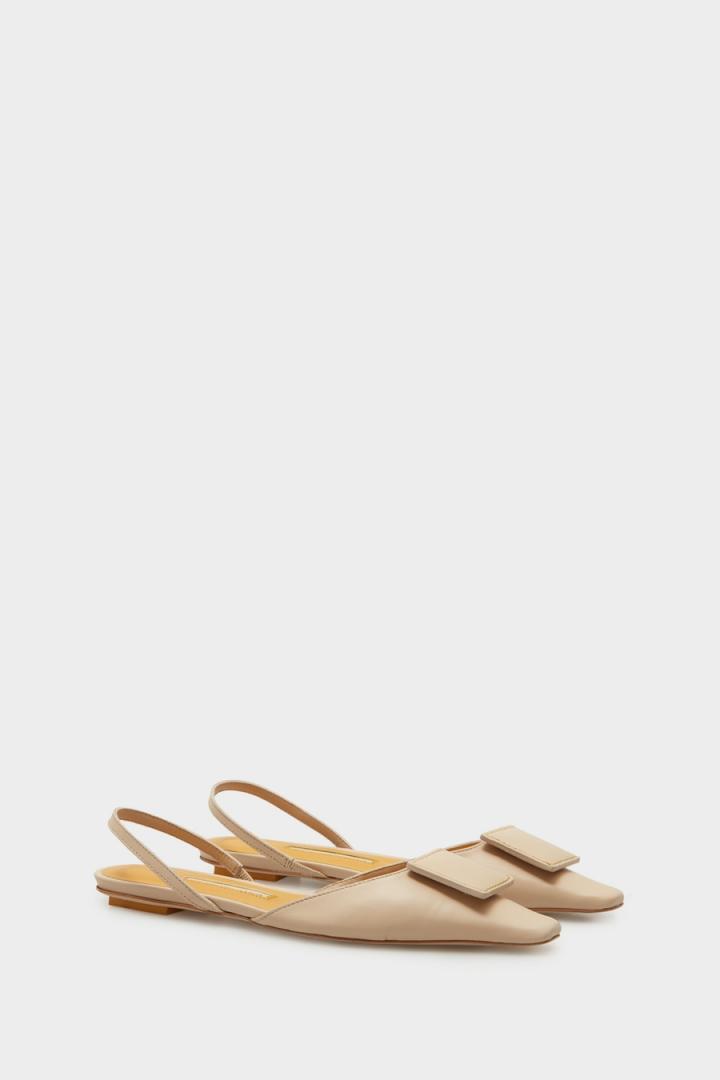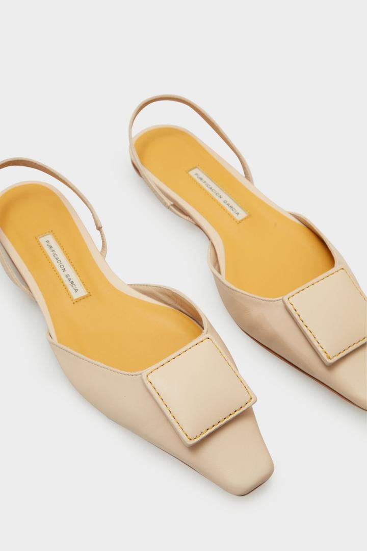 Zapato plano destalonado en piel de napa con detalle de cubo Pop acolchado a tono y pespuntes a contraste. Plantilla de piel a contraste.